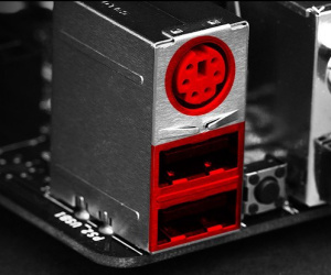 MSI has also released an image detailing a feature it calls Gaming Device Port, which sees a red-tinted block on the motherboard's input-output (IO) section play host to a single PS/2 and two USB 2.0 ports designed specifically for gaming keyboards and mice. Unlike regular PS/2 or USB ports, MSI claims, the Gaming Device Ports are optimised for high-polling rate mice running at 500Hz to 1KHz. Claims of lowered response times - dropping from 8ms to 1ms, MSI claims without reference to how it measured such things - are hard to quantify, but the company is also packing three times the thickness of gold plating onto the contacts to increase durability. The result, MSI claims, are ports rated for ten times the connections and disconnections of rival motherboards - something LAN party addicts may find a major selling point.